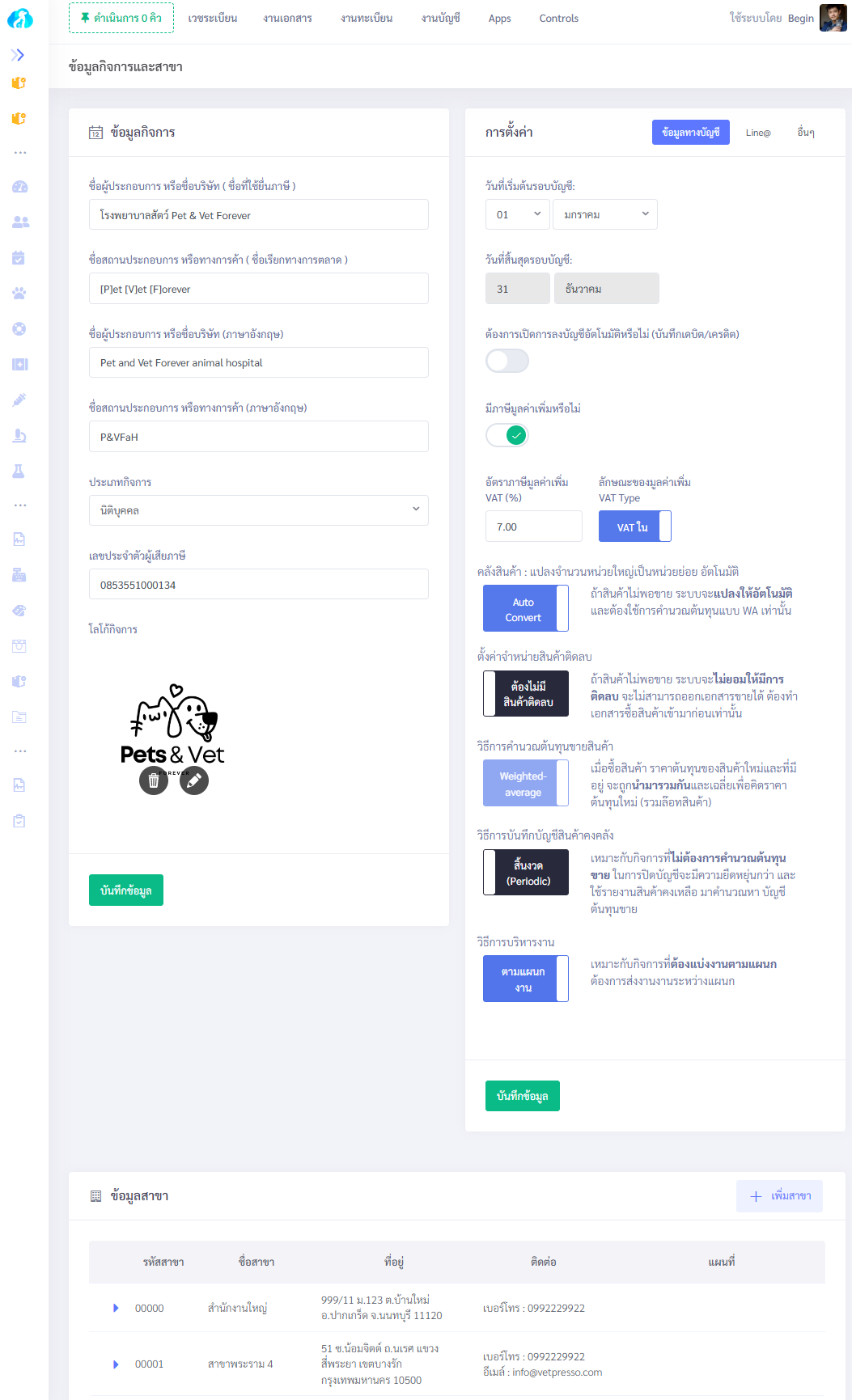 เมื่อเริ่มต้นระบบกับ Vetpresso ให้เริ่มตั้งค่ากิจการและสาขาเพื่อเป็นข้อมูลตั้งต้นพื้นฐานสำหรับกิจการ ใช้งานข้อมูลนี้ในการทำเอกสารสำคัญต่างๆ เช่น หมวดเอกสารขาย หมวดเอกสารซื้อ ยื่นแบบฯ นำส่ง